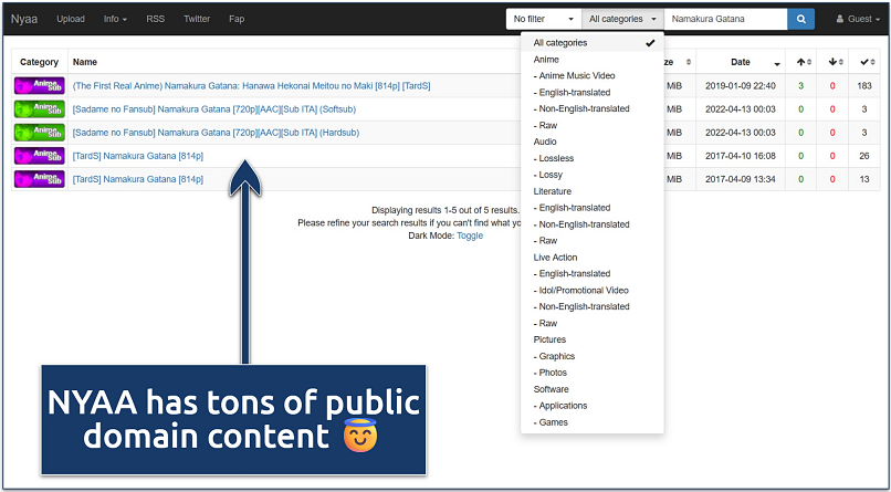 NYAA is a specialist site that focuses on content from Asia, especially from Japan, China, and South Korea. It's perfect if you're into anime series and manga, but you’ll also find fan-subbed dramas, K-pop and J-pop music, software, and niche JRPGs. As a fan of Asian pop culture myself, I couldn’t believe the range of cool stuff to explore.