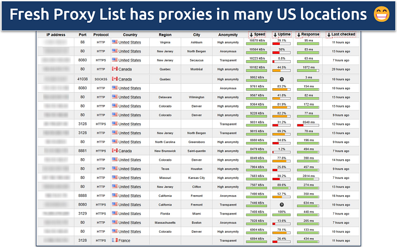 ProxyScrape refreshes its servers almost every minute for maximum uptime. Many free proxy list sites only update on an hourly basis. In our 4-hour test, we experienced no downtime while using multiple servers. At the time of our tests, it had 1124 proxies worldwide.