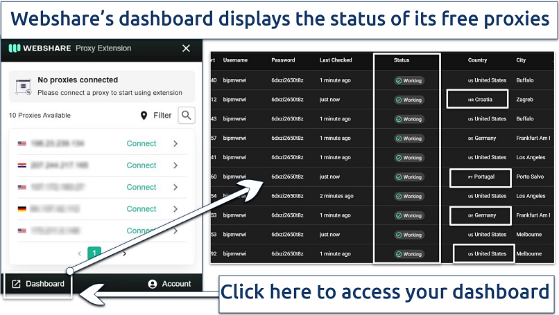 Webshare’s Chrome extension allows you to connect to free proxies with a single click without any manual setup. You get 10 free proxies, and can connect to them manually via your account dashboard.
