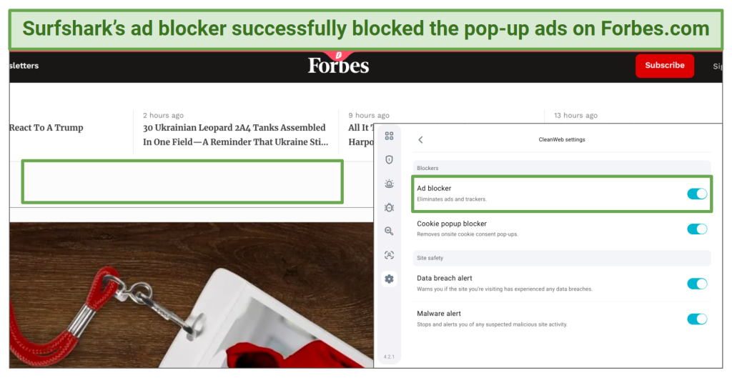 Surfshark's CleanWeb improves your Chrome browsing experience by blocking intrusive ads, trackers, and malware. By doing so, CleanWeb enhances your online security while speeding up webpage load times. During my tests, it worked perfectly to block ads on all the sites I tried. The only exception is video ads like those found on YouTube, but I haven’t found any blockers that can remove them.