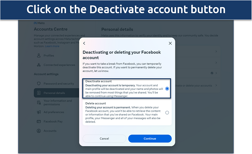 The steps to temporarily deactivate your Facebook account are nearly identical to the account deletion process. Just go to the Account ownership and control settings and click on Deactivation and deletion. Finally, select the Deactivate account option and re-enter your password to confirm deactivation.