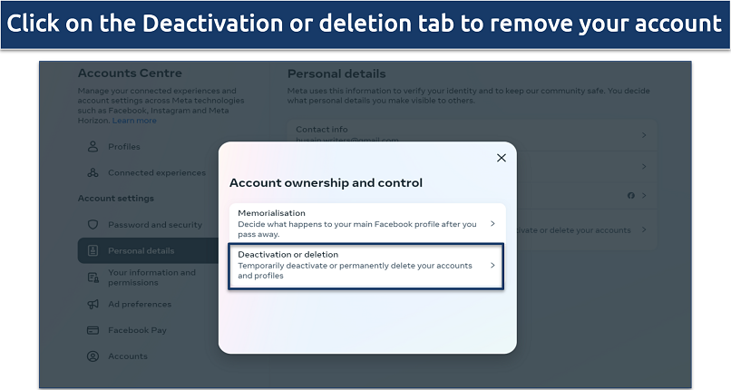 Step 5. Look for the Personal details tab, select it, and then click on Account ownership and control. If you have an account with another Meta product (like Instagram), you'll see those accounts here.
