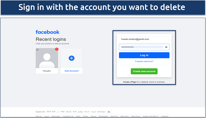 To delete another account you manage, you must first log in to that specific account. Each account has its own set of login credentials and must be deleted individually. That said, it’s generally a safe idea to make sure you back up your data before you proceed with deleting a Facebook account.