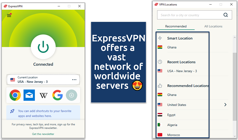 Pick a server close to you for faster speeds, or use the Smart Location feature to automatically connect you to the best server. Since all ExpressVPN servers are RAM-only (the servers automatically delete all data upon reboot), you can browse privately, no matter which one you choose.