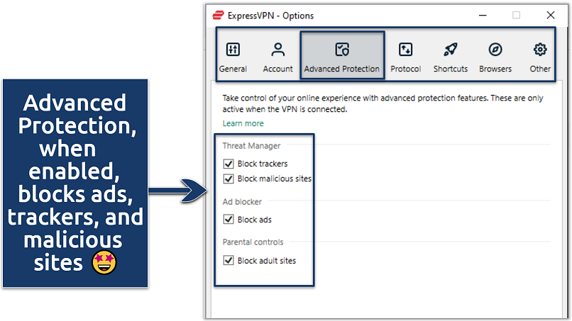 Sign in to the app using your account credentials and tweak the settings for optimal security and privacy. Enable features like automatic kill switches, DNS leak protection, and any available ad/tracker blockers, then select the VPN protocol that best suits your needs (or leave it to ExpressVPN to automatically choose one for you).