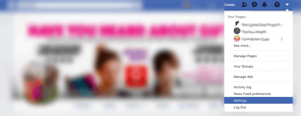 To get started, click the down arrow at the top right of your Facebook page, then click Settings.