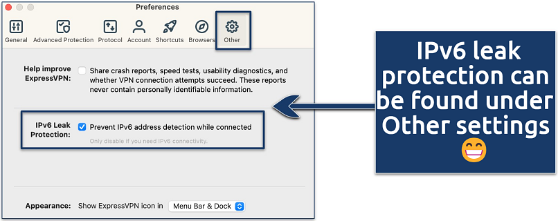 When you connect to ExpressVPN, DNS leak protection is enabled by default. However, you need to manually enable IPv6 leak protection. Here’s how to do it: