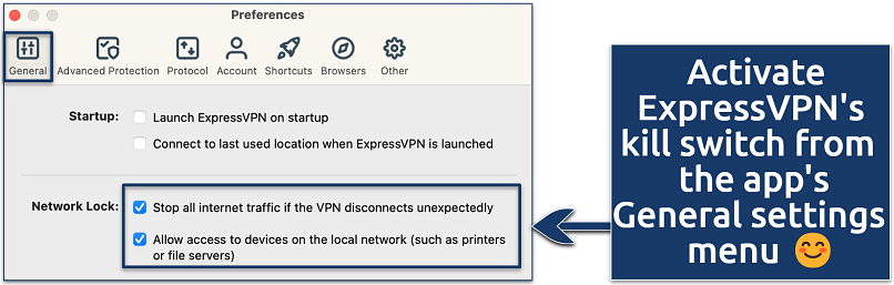ExpressVPN’s kill switch (Network Lock) automatically blocks all internet traffic if your VPN connection drops. This is important because a sudden switch from a VPN server IP address back to a Chinese IP, even briefly, creates an unusual traffic pattern that can trigger the Great Firewall's VPN detection system.