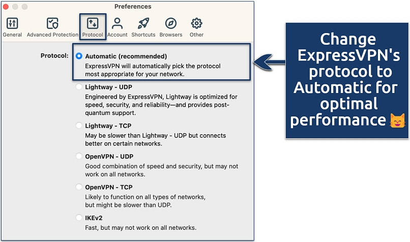 When set to Automatic, ExpressVPN adjusts to the network conditions to ensure that you have more reliable connections. This is important since the Great Firewall is constantly updated to block VPN traffic. By letting the app handle these adjustments, the VPN can remain undetectable without any manual configuration.
