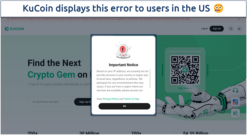 When you’re on KuCoin’s site in the US or try to log in, you’ll see the following error message: