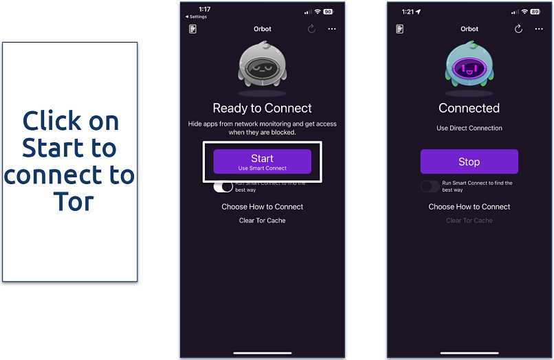 Step 2. Open the Orbot app and click the Start button to use a secure tunnel to connect to the Tor network.