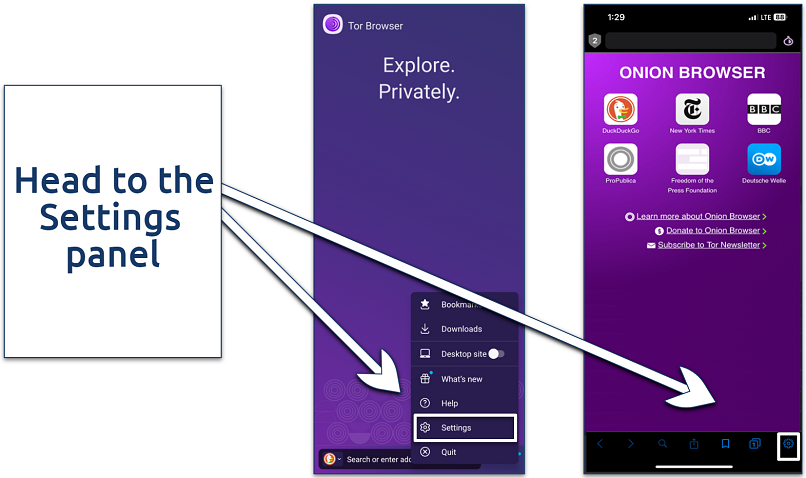 Step 1. Launch the Tor Browser app or the Onion Browser app on your device. Tap the three-dot or the gear icon and enter the Settings menu.