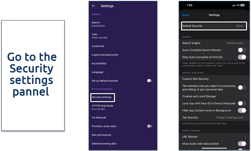 Step 2. Tap on Security Settings or Default Security, depending on your browser.