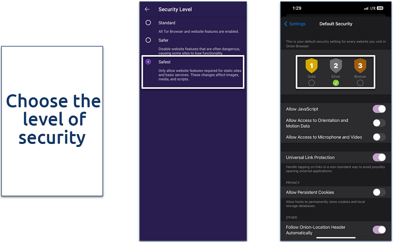 Similarly, the Onion Browser also has 3 security levels — Gold, Silver, and Bronze. The Bronze level maintains the lowest security, allowing scripts and access to videos and your microphone by default. The Silver level restricts access to your microphone and other features but permits JavaScript, while the Gold level severely limits all access and scripts.
