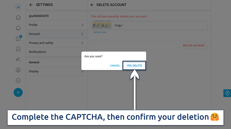 Enter the CAPTCHA displayed at the top of the page. If the initial code is unreadable, you can refresh and display a new code. Once the CAPTCHA is complete, confirm account deletion by clicking or tapping Delete Account again. With that, your account will be deleted — you should receive a confirmation email shortly after.