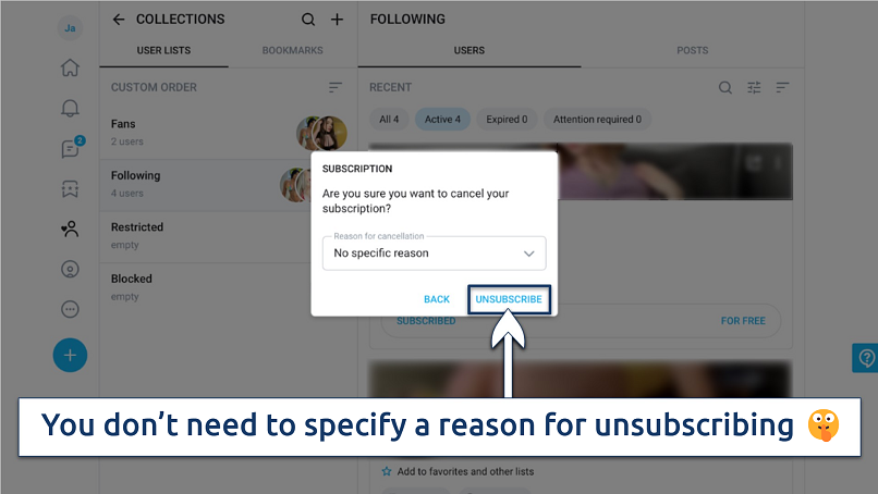 Select the Active tab for ongoing purchases. Under the account you wish to unsubscribe from, tap or click Subscribed. Then, tap or click Unsubscribe for every content creator. This will stop the purchase from auto-renewing. If you’ve still got money in your OnlyFans wallet, you may also consider tipping your favorite creators before you delete your account.