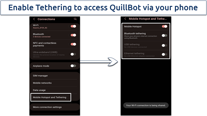 If your WiFi network blocks QuillBot, switching to mobile data can help you bypass these restrictions. To use QuillBot on a computer or tablet, you can share your mobile connection through tethering (hotspot):