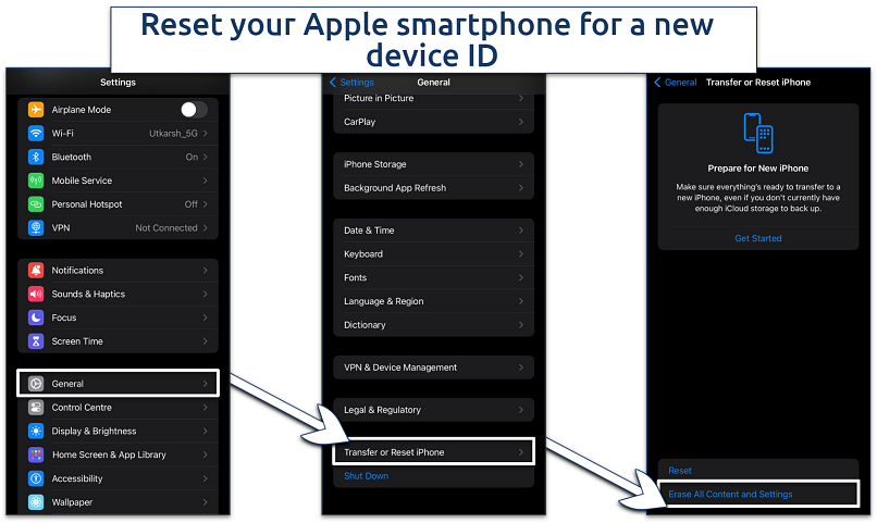 - On iPhone: Go to Settings > General > Transfer or Reset iPhone > Erase All Content and Settings.