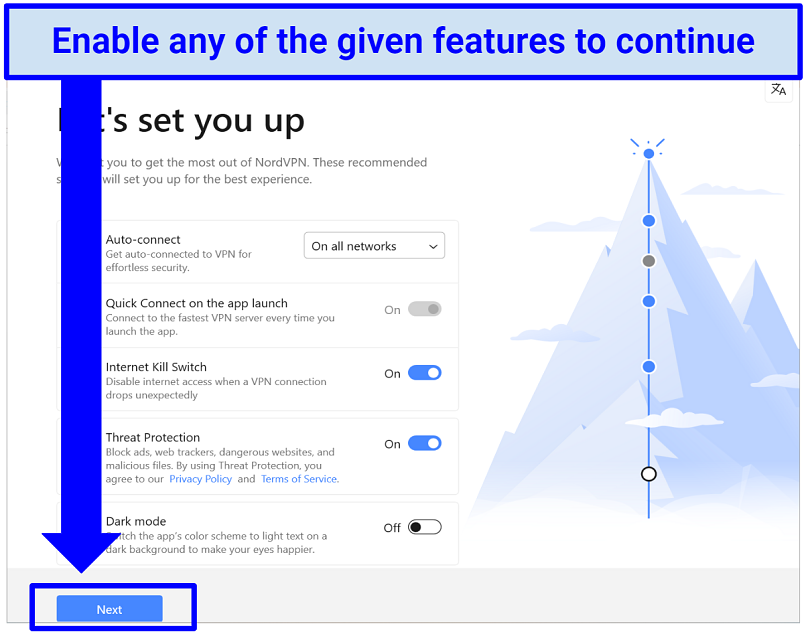 You can select NordVPN features such as turning on auto-connect, kill switch, Threat Protection, and Dark Mode
