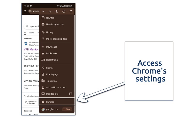 4. Once the search results appear, tap the three dots (⋮) in the top-right corner of the screen. From the dropdown menu, select Settings.