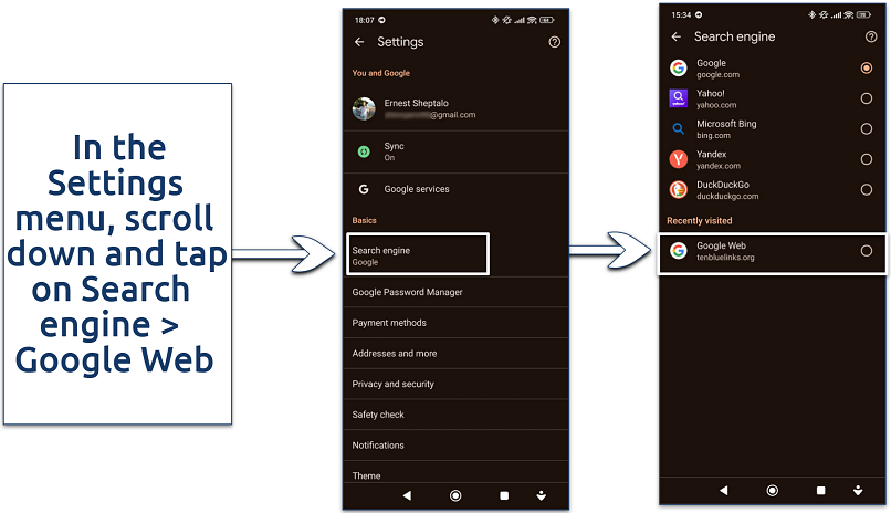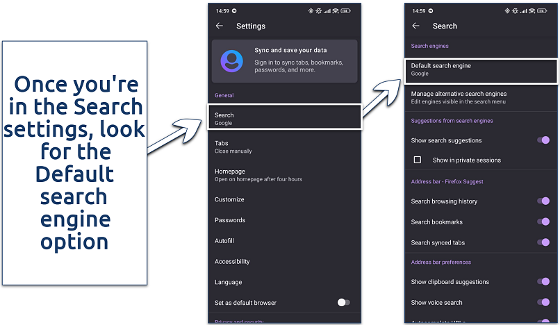 3. In the Settings menu, scroll down and tap on Search > Default search engine.