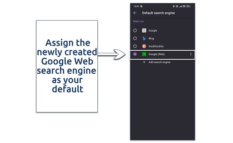6. Return to the Search settings. Tap on Default search engine. Select Google (Web) from the list.