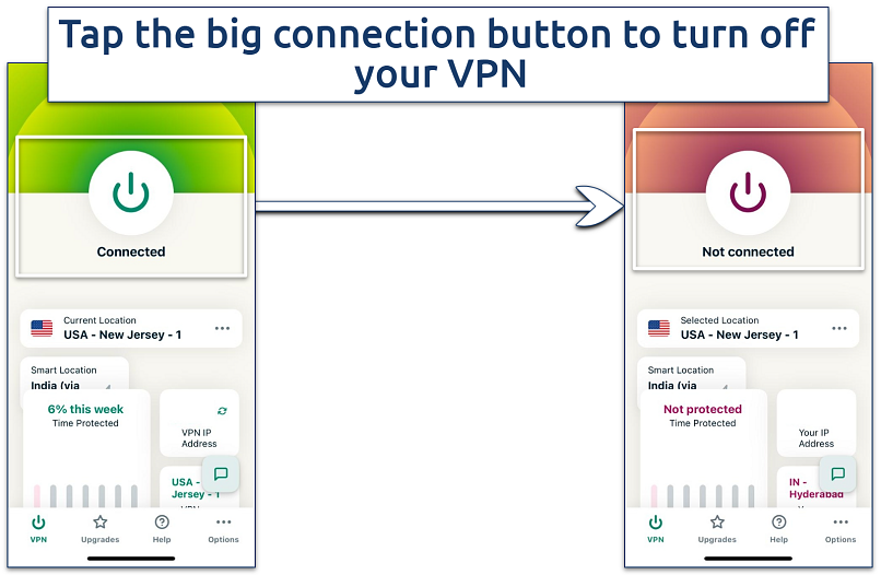 On the app’s main screen, you’ll usually see a Connected status or a button indicating the VPN is active. Tap it or look for the Disconnect button to turn off the VPN. - Confirm if needed.