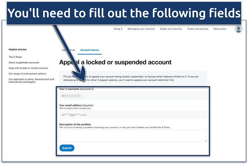 - Include your username (e.g., @YourHandle) and the email address linked to your account.