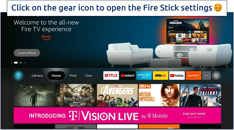 Click the gear icon on the Fire Stick home screen to open the settings.