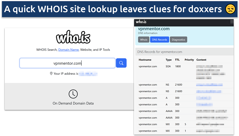 - WHOIS database mining: Searching domain registration records for websites and blogs often shows private information. WHOIS databases can reveal domain owners' names, addresses, phone numbers, and email addresses.