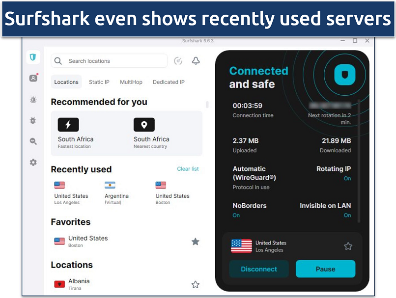 The apps are user-friendly, with an uncluttered interface that makes them easy to navigate, even for beginners. Click the Quick Connect button to automatically use the fastest server for your network and location. You can also type a country name into the search bar to find a specific server. Surfshark even recommends some optimal servers based on your network and location.