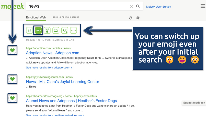 With Mojeek, you can filter searches based on a selection of emojis. For example, suppose you type in “news” and select the heart emoji. In that case, you’ll get the latest heart-rated news stories. To do this, open Mojeek and click Emotion on the top right corner of the screen. Next, choose your emoji.