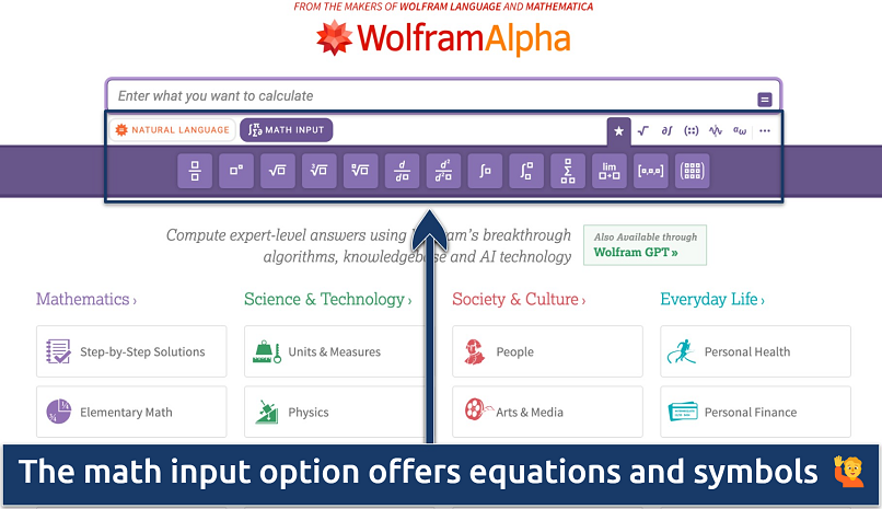 WolframAlpha computes answers using objective data sourced from credible references. It’s ideal for researching academic topics, with categories like math, science and technology, social science, and culture. There is even a math input tool and an extended keyboard to simplify entering complex equations.