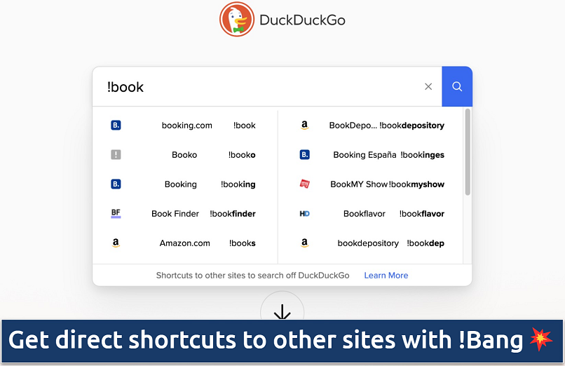 The search engine comes with a shortcut feature called !Bang that lets you search sites like eBay, Wikipedia, and Amazon with a single click. To use !Bang, type an exclamation mark to the left of your search query. The feature has existed since 2008 and has thousands of bangs already. You can even submit your own bangs.
