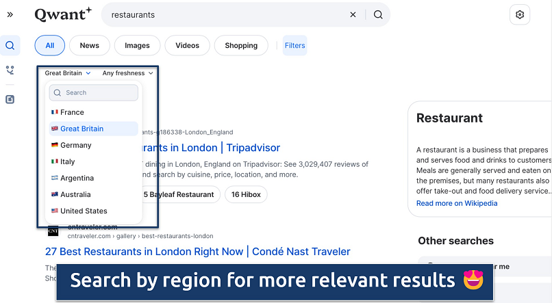 Qwant lets you customize your search by country to get localized results. For example, you can still find stores near you that sell a specific item, even without providing any location data. You can do this in Settings or on the search results page. Click on your current region to reveal a dropdown where you can scroll to whichever country you prefer.