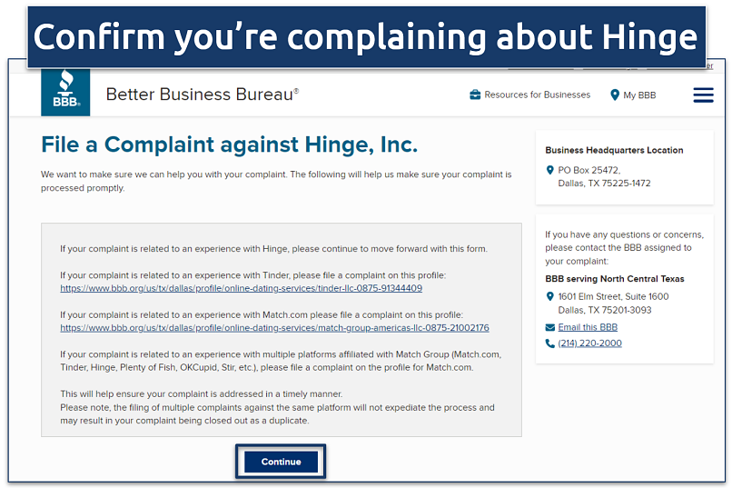 Step 2. Make sure the system confirms you're filing the complaint against Hinge — then hit Continue.