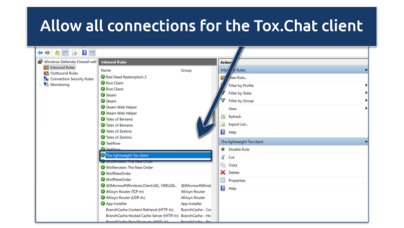 Once downloaded, double-click the Tox client to launch it. If it doesn’t launch, your firewall may be blocking it. To fix this on Windows, open Windows Defender Firewall, go to Advanced Settings > Inbound Rules and create a new rule to allow the Tox client through. Then, restart the app and try again.