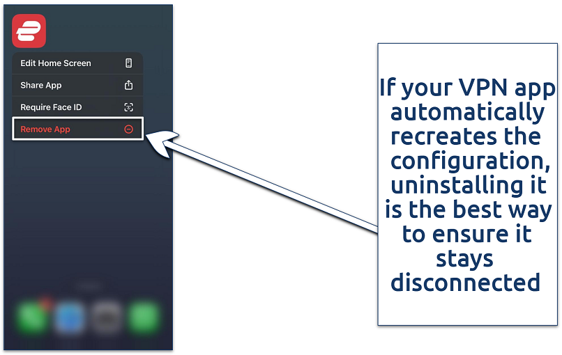 Usually, deleting the VPN configuration fixes this issue. However, some VPNs create configurations automatically, or you might accidentally allow permissions to do so when you open the app. To avoid this from happening, the easiest solution is to uninstall the app.