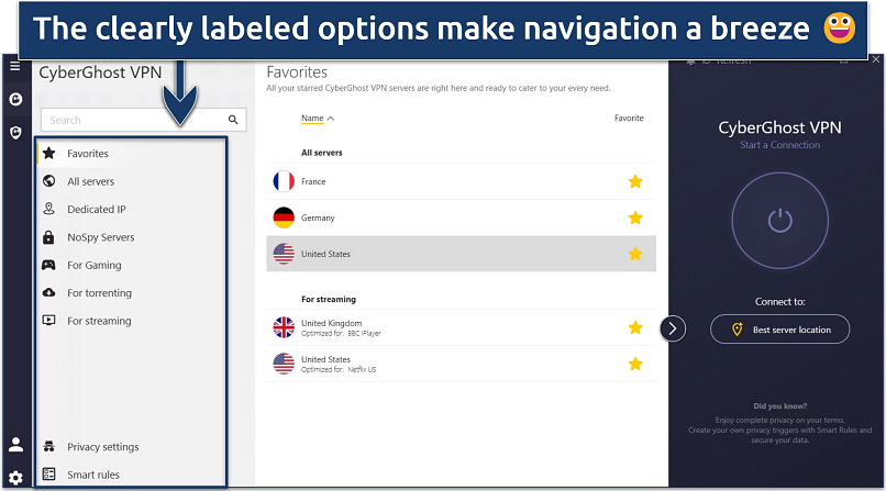 CyberGhost takes the guesswork out of server selection with specialized options for streaming, gaming, and torrenting. Each server is clearly labeled and optimized for its purpose. The streaming servers deliver buffer-free viewing of specific platforms, gaming servers maintain low ping rates, and torrenting servers balance fast downloads with privacy protection. This ensures you can always find the right connection for your needs, all without breaking the bank.