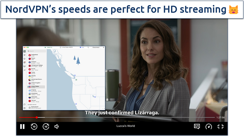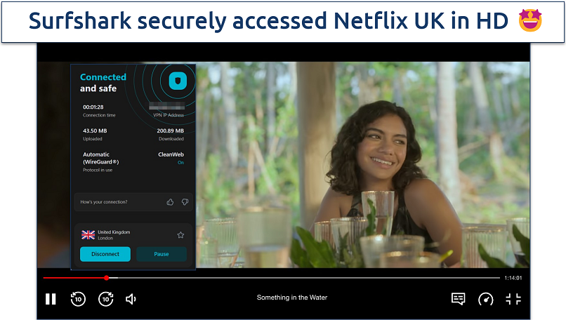 The VPN includes a vast server network that delivers consistent streaming performance. In our tests, Surfshark securely accessed major platforms like Netflix, BBC iPlayer, Amazon Prime Video, and Disney+. We could watch our favorite shows in HD without buffering, even during peak hours. Speed loss on nearby servers rarely exceeded 20%.