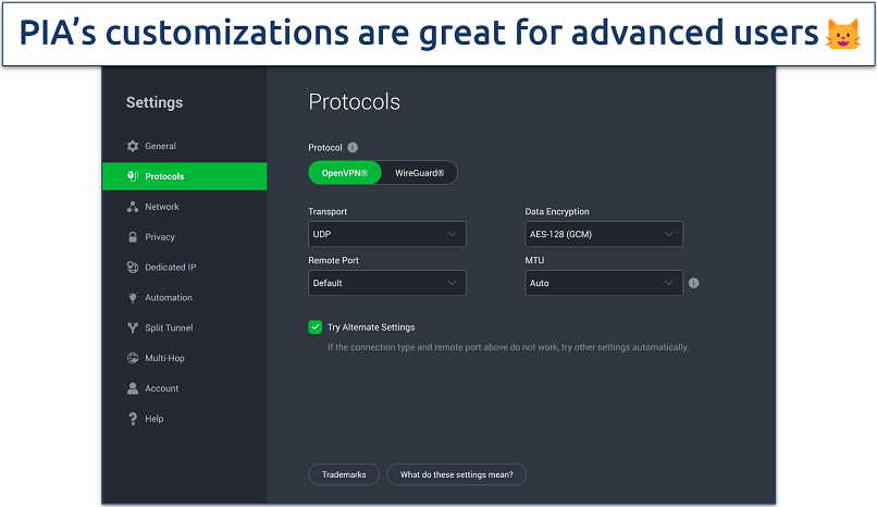 PIA offers tons of customization options, letting you fine-tune your connection to match your needs. You can choose between the ultra-secure OpenVPN and the faster WireGuard protocol. With OpenVPN, encryption is adjustable between AES 128-bit and 256-bit, giving you the option to prioritize speed without compromising much security. This level of flexibility is rare among budget VPNs, making PIA a great choice if you want more control.