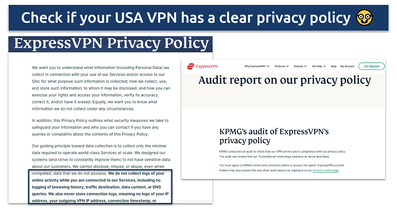 Military-grade encryption keeps all your online activities private. Plus, ExpressVPN’s strict no-logs policy has been independently verified by trusted firms like PwC and KPMG, so you can rest assured that your data isn’t collected, stored, or sold. While testing the USA servers, I didn’t detect any IP/DNS/WebRTC leaks, either.