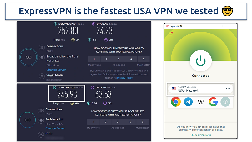 ExpressVPN is the fastest VPN we tested for the USA. Its in-house Lightway protocol delivers top connection speeds while being energy-efficient on mobile devices. Our download speed dropped by only 3% when testing ExpressVPN US servers. That’s impressive, as many VPNs, especially the free ones, can slow you down by over 50%. Besides, this VPN doesn’t impose data caps, meaning you can use it as much as you want.