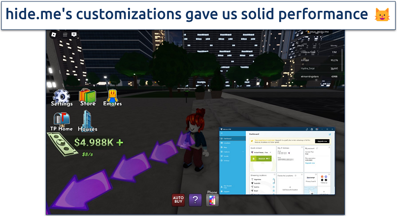 - Auto-connect. You can set hide.me to automatically connect to your preferred server when you start your device. This means you don't have to manually enable the VPN every time you want to play Roblox.