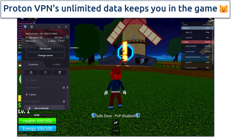 Proton VPN’s free offer offers unlimited data, so you can play Roblox as long as you want without disruptions. Most free VPNs cut you off after a few hours, but we played Arsenal and Blox Fruits for over 4 hours without lag or sudden disconnects. Since it’s a fast-paced shooter, even a slight delay can cost you a match, but we very rarely experienced any lag or framerate drops.