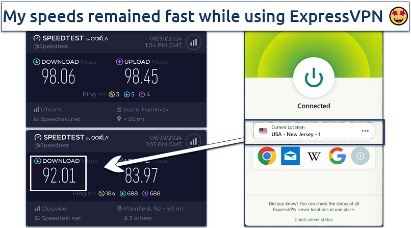 Speeds | 92.01Mbps (6% slower than my usual connection) |