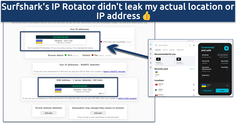 Surfshark’s IP Rotator automatically changes your IP address during your session without disconnecting, making it harder for trackers to follow your activity. In contrast, NordVPN assigns a single IP per session. This makes Surfshark a better choice for users seeking extra privacy. During my tests, I had no disconnects using Surfsharks IP rotator.