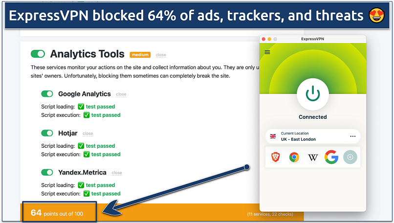 The ad blocker works well with ExpressVPN's other privacy and security features to give you comprehensive protection. It not only blocks ads but also prevents your device from connecting to known malicious domains and stops trackers from monitoring your online activity. It blocked access to several phishing sites I tried to visit and prevented social media trackers from following me across websites.