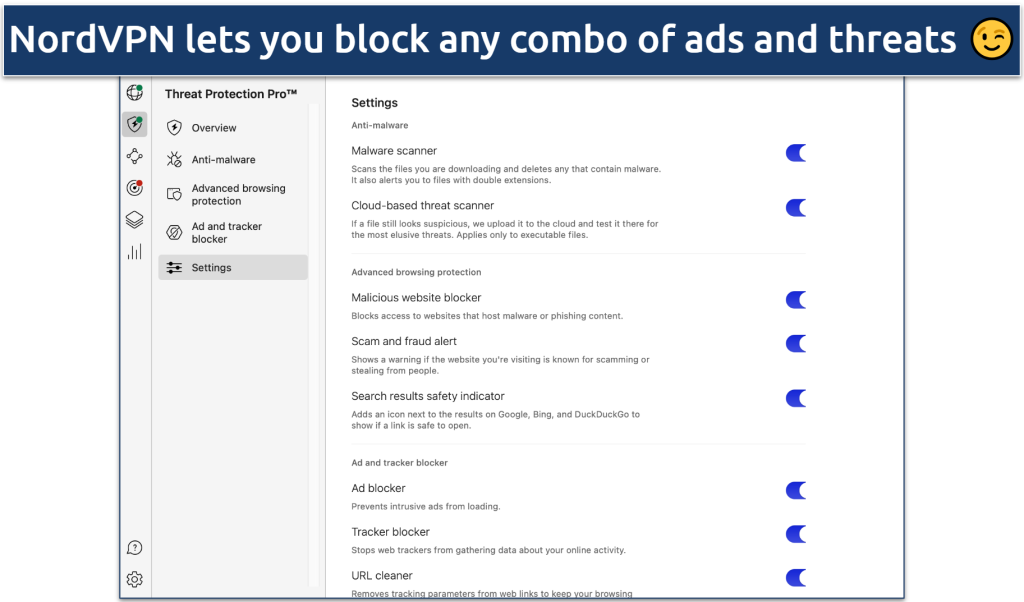 NordVPN's Threat Protection Pro offers comprehensive protection against ads, trackers, and malicious content across your entire system. During my tests, it blocked intrusive ads on almost every site. What impressed me most is that it doesn’t enforce a one-size-fits-all approach — it lets you decide what gets blocked, where, and how.