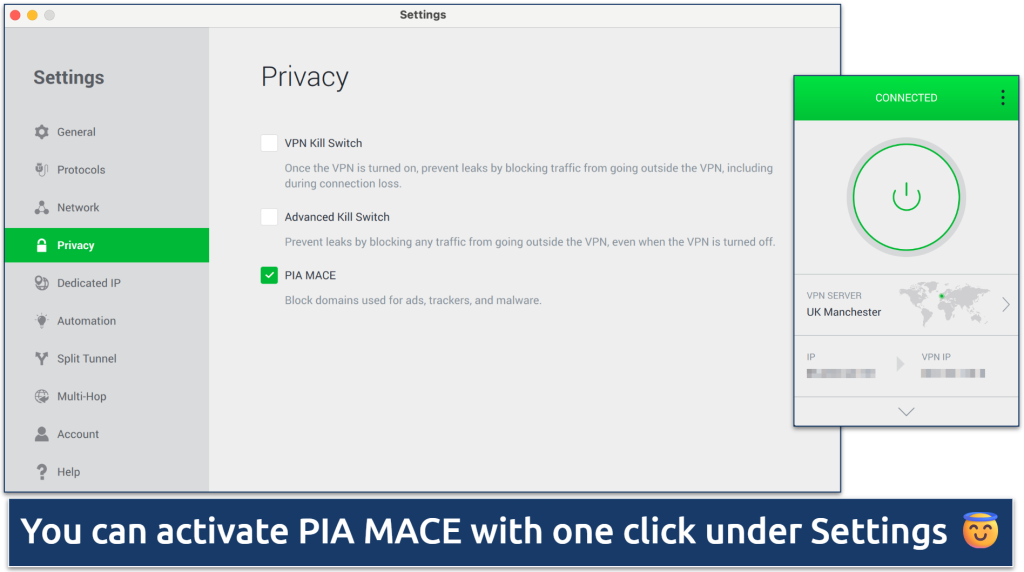 Unfortunately, new VPN users might find PIA complicated. However, all apps come pre-configured, so you can start using the VPN right away without tweaking any settings. Plus, MACE can be toggled on with just a click. You can try PIA for free with its 30 money-back guarantee.